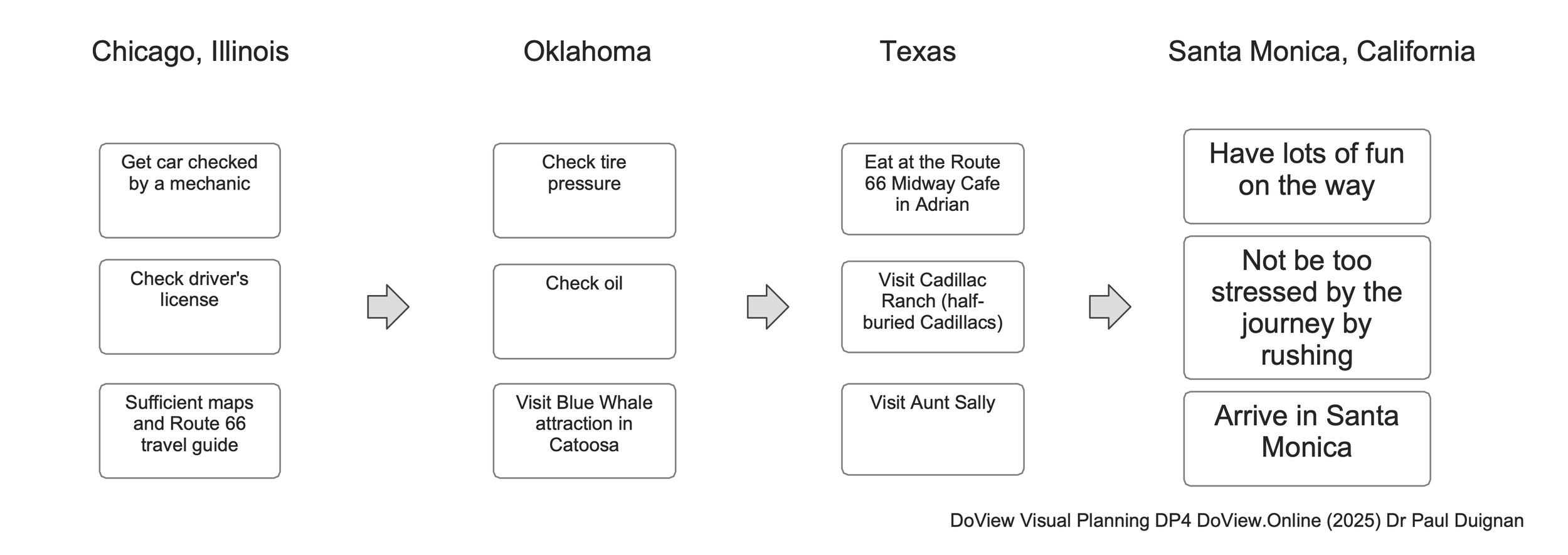 DoView outcomes/strategy diagrams are used to present any type of strategy in a visual format, one that is much more accessible than traditional text-based planning documentation. Such diagrams can be used for any kind of initiative, organisation, policy, strategy, research project (and potentially to represent what AI agents are doing). We should consider DoViews as a type of ‘This-Then’ diagram, outlining all of the needed steps to get to desired outcomes. It is useful to think of DoViews as being similar to the ‘This-Then’ logic of the steps that one would lay out to describe a successful road trip, as shown below.