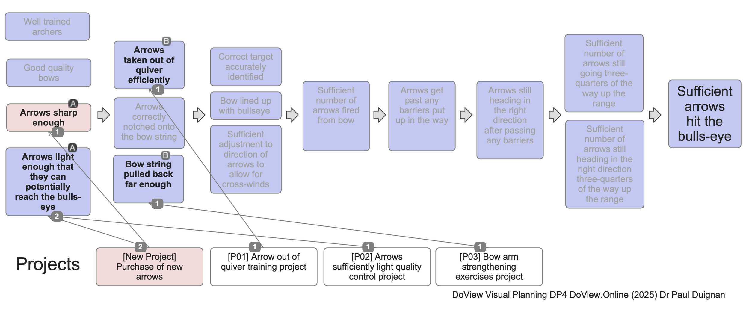 DoView diagrams are drawn according to a set of DoView Drawing Rules which detail the rules for drawing DoViews. Here is an illustrative DoView for a fictitious ‘Archery Project’. It is used on this page and in our 100+ DoView Tools to illustrate how DoView Planning is done.