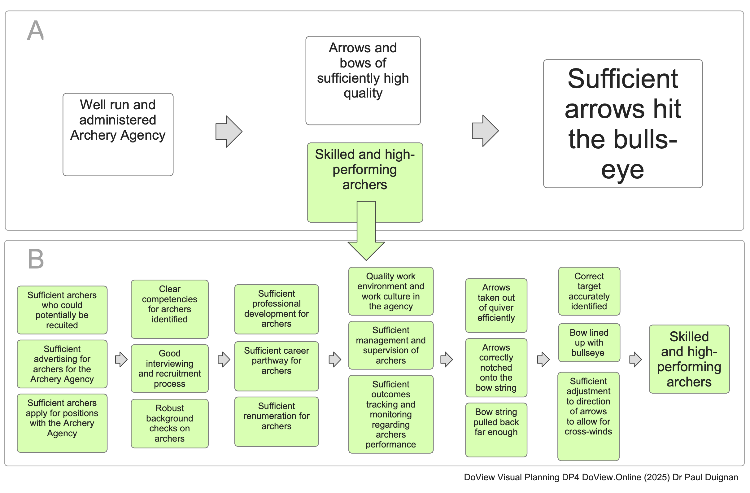 Real-world DoViews normally require more than just a single page, such as the archery example above. They therefore typically have an overview page that contains boxes with the names of the subpages in the diagram, which, when clicked, drill down to the particular subpage. When used in apps such as PowerPoint, Google Slides or our legacy app, a user can use this feature to get a helicopter overview and then immediately drill down to examine the details of any subpage. They can then quickly jump back up to return to the overview page. Structuring DoViews in this way makes them much more accessible as planning documentation and far easier to work with than a text-based strategic plan containing the same material. Below, you can see how the Archery Project DoView could be set out as an overview page [A] and a set of drill-down pages, one of which, Skilled and high-performing archers, is shown here [B].