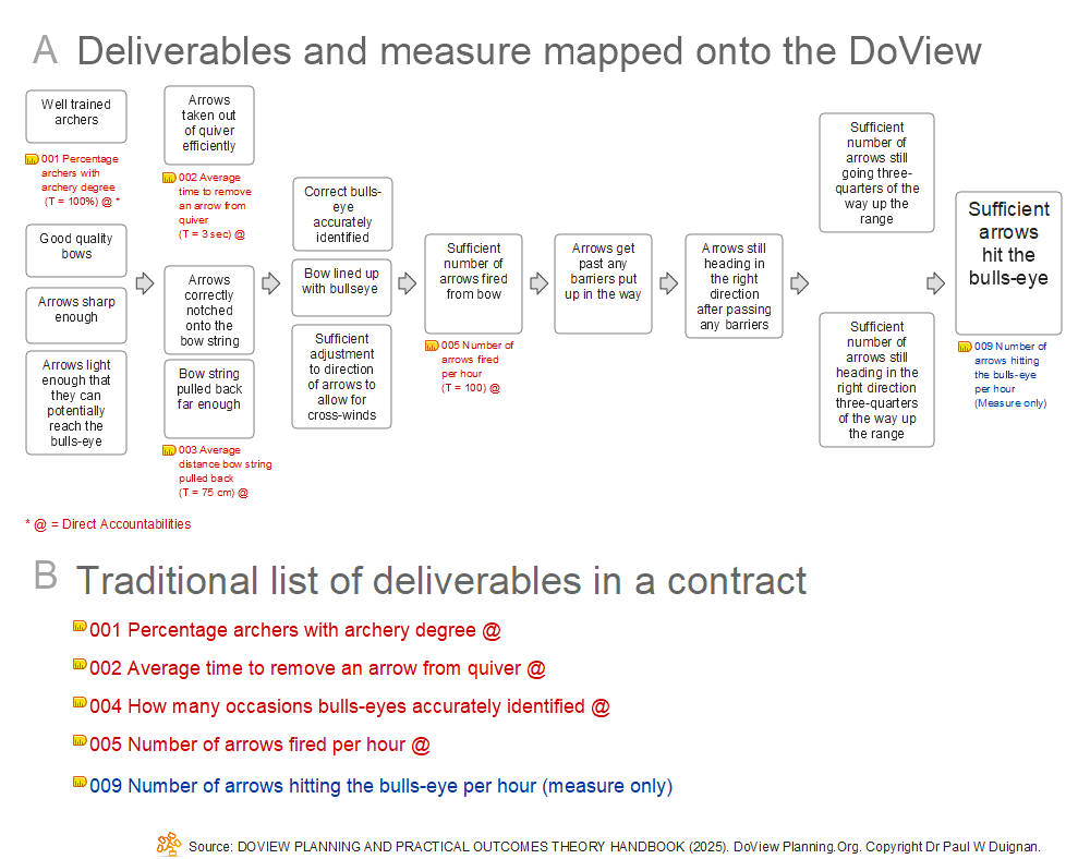 In the diagram below, ‘A’ shows the contract deliverables with targets mapped onto the relevant DoView. There is also one measure for the final box (in blue), which is just a requirement that the provider measures and reports on this, but they are not held directly to account for it in this case because of the other factors which affect its achievement–the wind and the number of barriers on the archery range. ‘B’ shows the traditional approach to contracting where all that is given is a list of deliverables without placing them in the visual context of the relevant DoView.