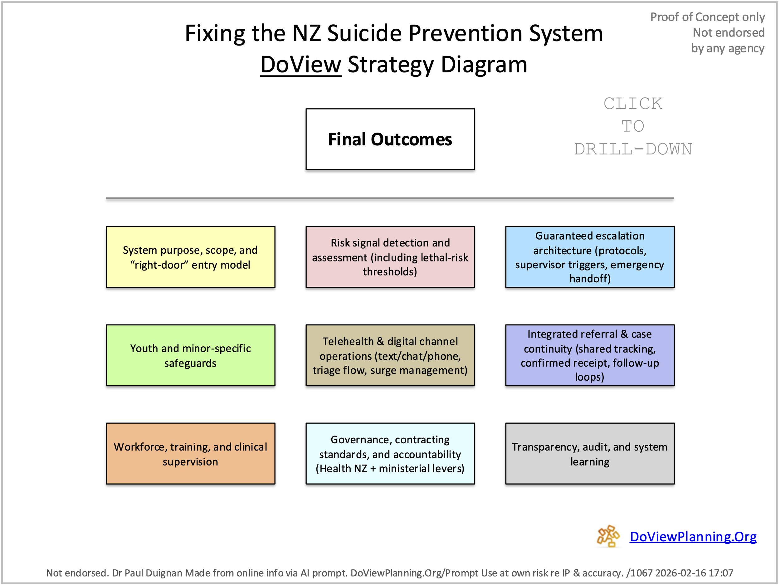 In this case, the Minister made statements about how the government would respond. They could complement these statements by getting a draft DoView strategy diagram drawn within minutes by using the free AI DoView Drawing Prompt. They could then take this DoView (which is in PowerPoint) and amend it with officials. They could then prioritize the boxes they are going to act on and immediately start implementing it using the DoView Planning approach. The example below can be downloaded now and anyone can use it for planning regarding suicide prevention.