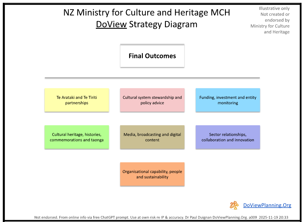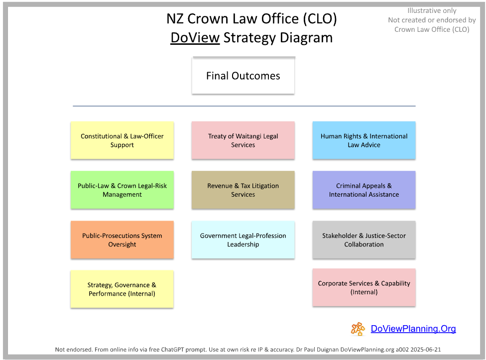 DoView below shows how a Whole of Government DoView can be built. In this case, it is an illustrative Whole of Government DoView for the New Zealand government. If you click in it, you can immediately drill down first to a set of high-level cross-sector government targets. In this illustrative DoView these are based on the current New Zealand governments set of nine targets. DoView Strategy Diagrams have been built for each of the nine target areas. These set out the possible steps that could be taken to achieve these targets. While the targets are current government targets, these DoView are illustrative and not created or endorsed by the NZ government. In the Whole of Government DoView you can also drill down to DoViews for individual government departments. In this illustrative version of the NZ Whole of Government DoView, only some government agencies’ DoViews have been included. These and more individual government agency DoViews are given further down this page. Any of the DoViews on this page could easily be included in the NZ Whole of Government DoView.
